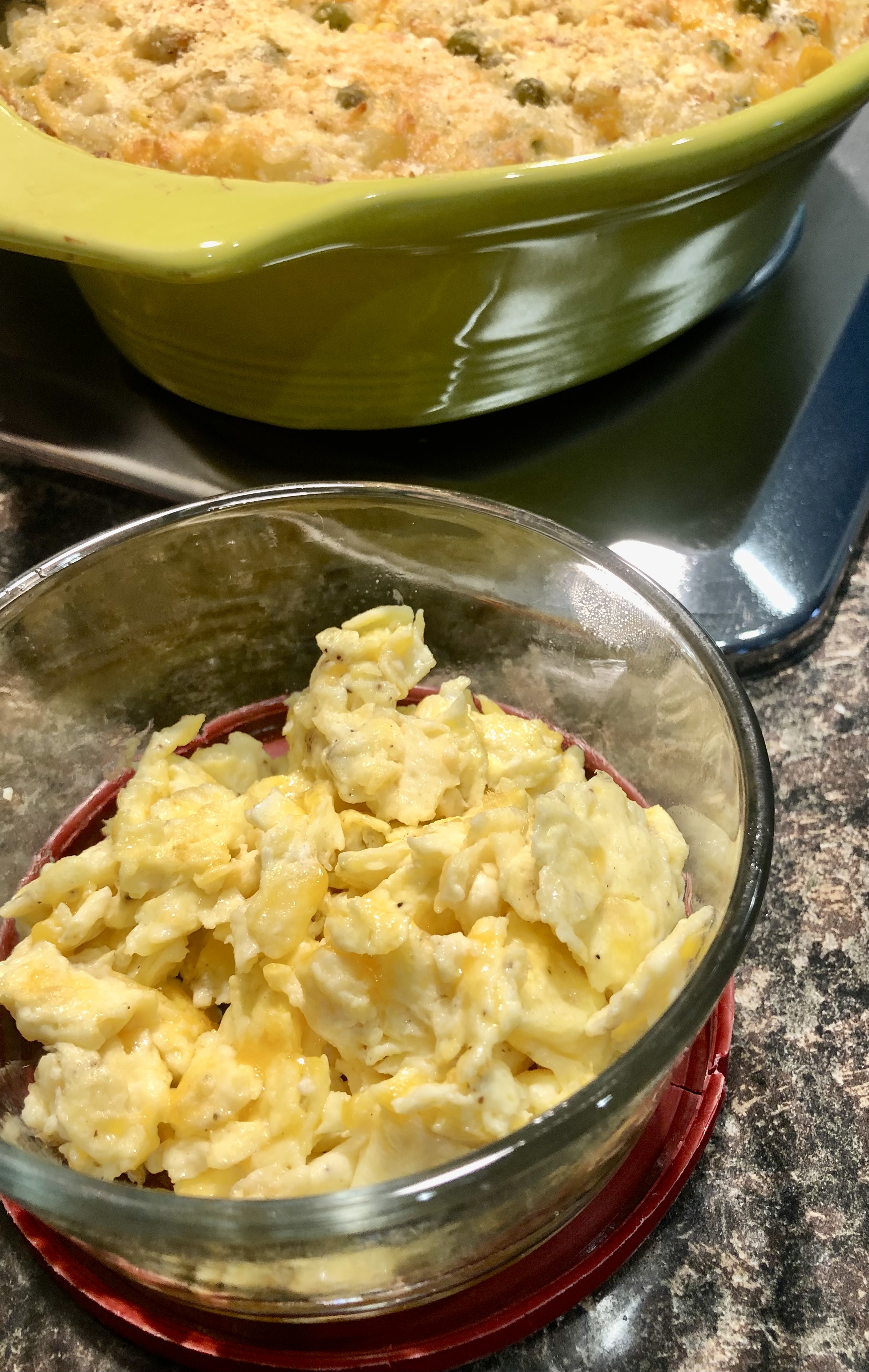 I continued with my heated skillet and a little melted butter over medium heat. The results were pleasing! It looks, and tastes like I cracked the eggs right out of the carton. I added some cheese and Voila! You can see the results next to my chicken casserole I had in the oven while I was experimenting. I think this is a great idea to do if you find a really great price on eggs. I haven’t tried them in a baking recipe yet, so if you do, please let me (and our readers) know.